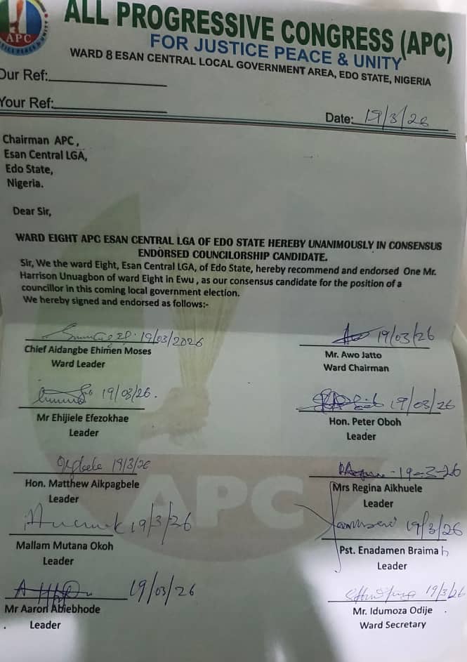 In a resounding show of unity, the Ward 8 APC Esan Central LGA of Edo State has thrown its weight behind Hon. Harrison Unuagbon as their consensus candidate for the forthcoming local government election. A letter addressed to the APC Chairman, Esan Central Local Government Area, and signed by prominent leaders and ward executives, recommends […]